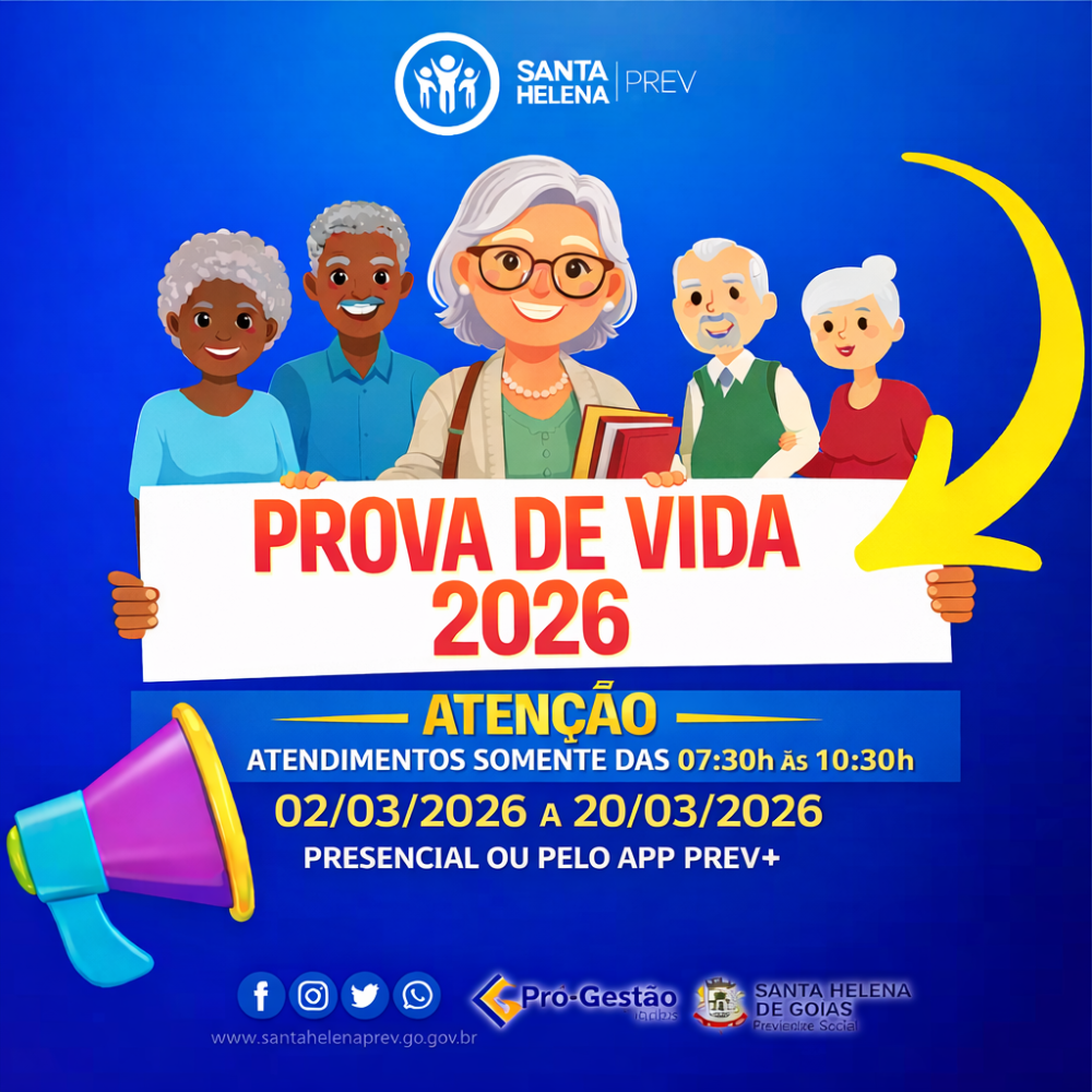 O Instituto de Previdência de Santa Helena de Goiás (Santa Helena Prev) informa que o Recenseamento e Prova de Vida para os segurados inativos será realizado no período de 02 de março a 20 de março de 2026, das 07h30min às 10h30min, na sede do Instituto, localizada na Prefeitura Municipal na Avenida Antônio Gonçalves, Qd. 26 Lt. 01 Parque Residencial Isaura - 1° Andar.